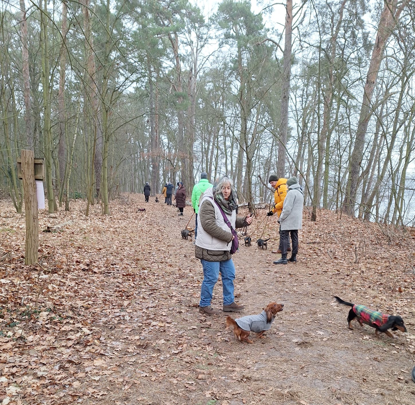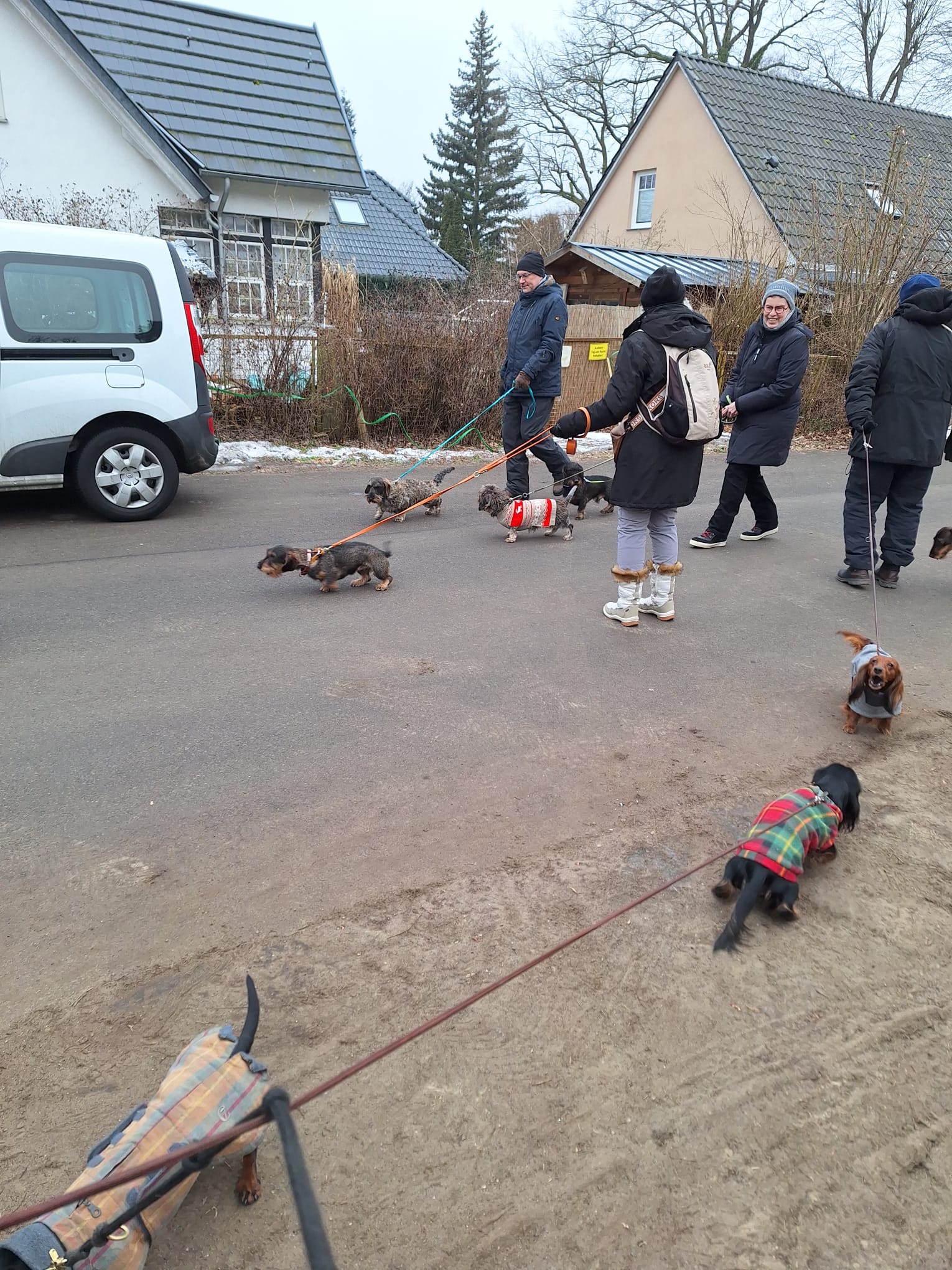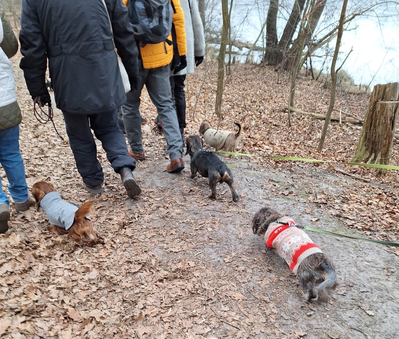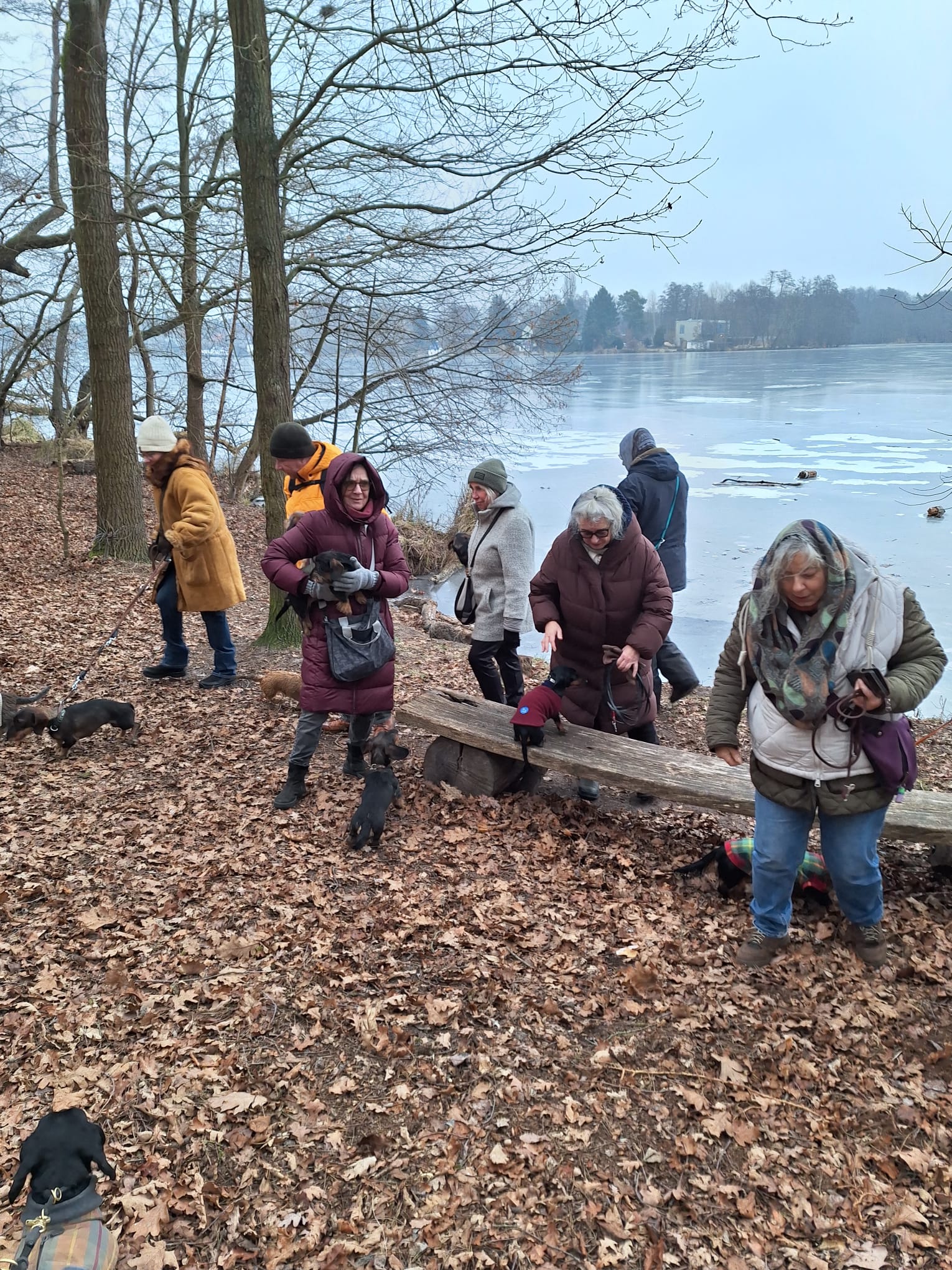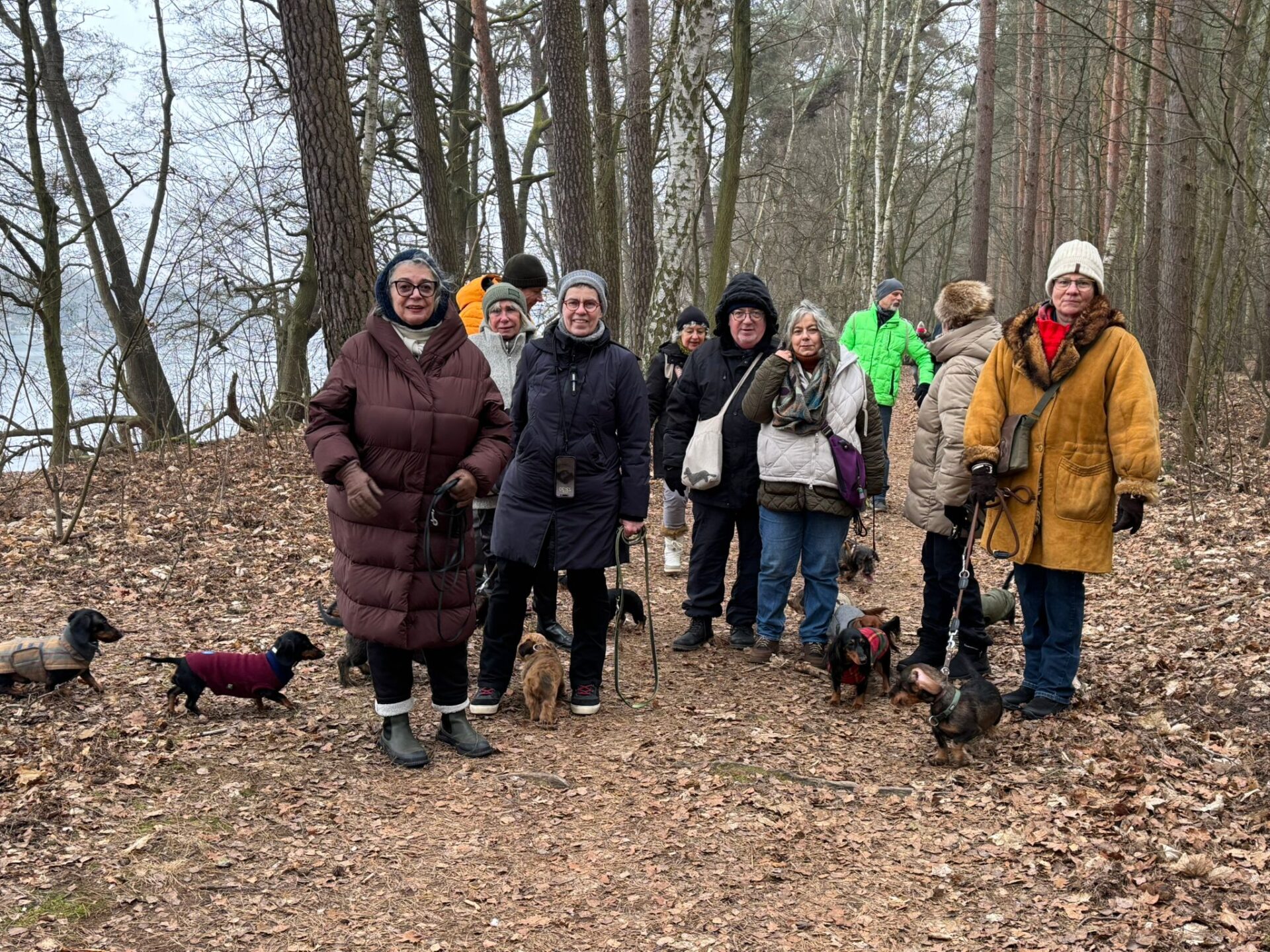 Mal wieder zu Besuch im Jagdrevier von Bella und Donnie im südöstlichsten Zipfel von Berlin – Schmöckwitz. Einschließlich der beiden Gastgeber trotzen 15 begleitete Dackel den widrigen Temperaturen des Januars, die meisten Aufrechten schick verkleidet bzw. eingemummelt. Unser Rundweg führte uns zunächst entlang am sog. „Großen Zug“, dem Verbindungsgewässer zwischen Krossinsee und Dahme, zurzeit verwandelt in eine arktische Eisfläche. Am Kinderspielplatz „Rauchfangwerder“ zog auf dem Eis sogar ein einsamer Schlittenführer seine Bahn. Vielleicht doch etwas waghalsig. Die Dackel blieben lieber auf festem Boden auf dem Weg. Zurück gings durch den Wald und hier konnte man sogar ein bisschen Grün (Moos) sehen, wohltuend im sonstigen Grau des Berliner Winters.