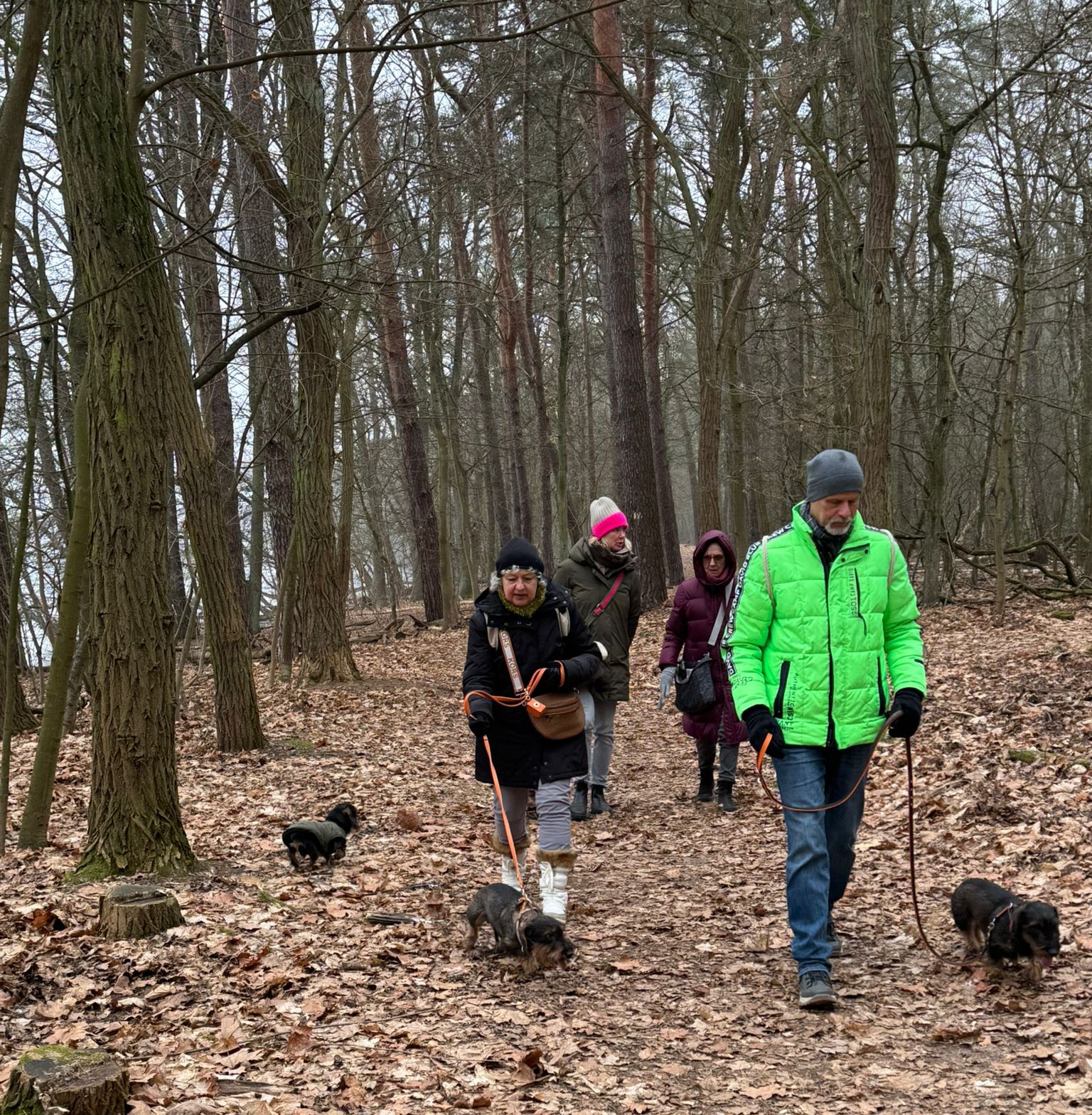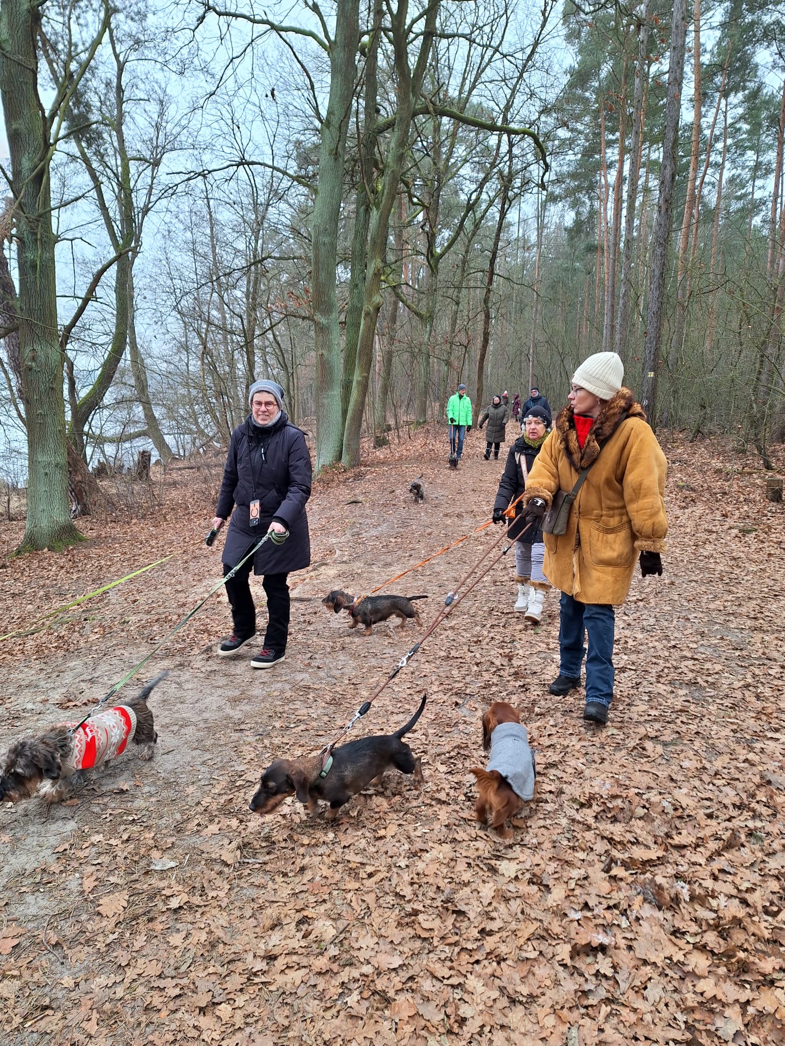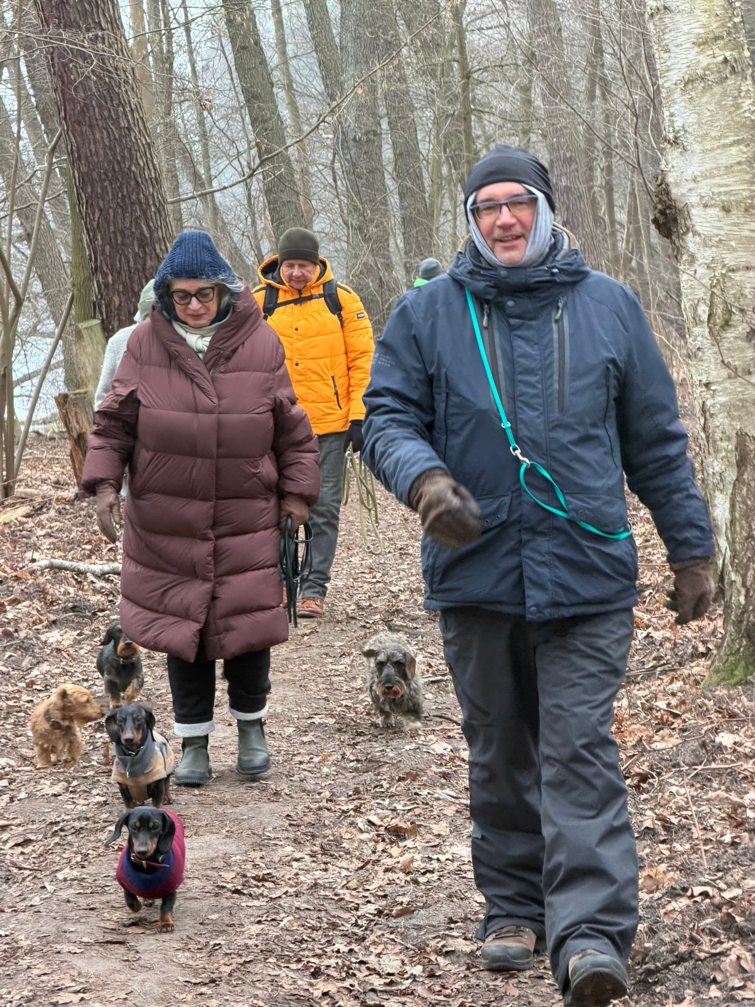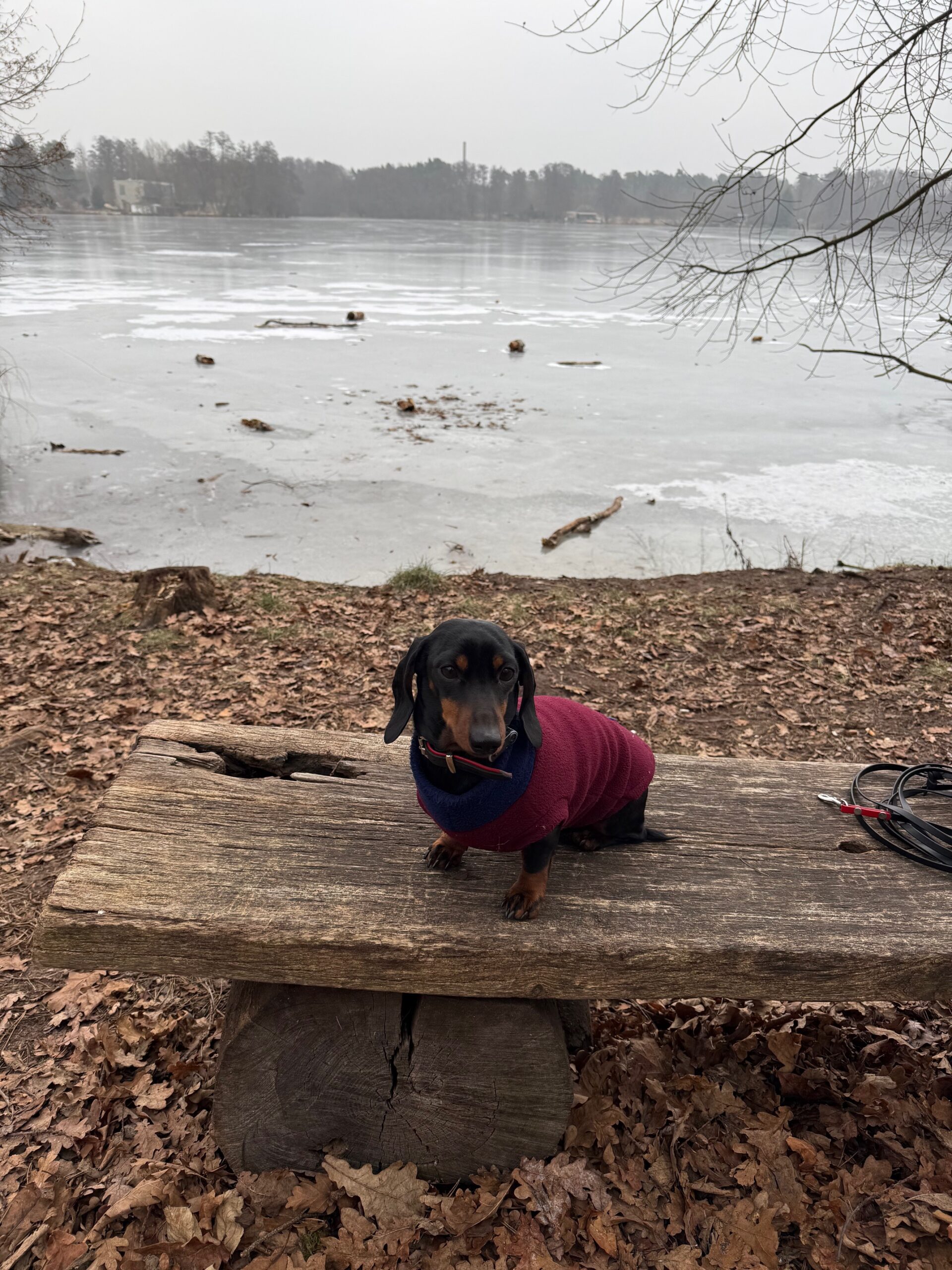 Mal wieder zu Besuch im Jagdrevier von Bella und Donnie im südöstlichsten Zipfel von Berlin – Schmöckwitz. Einschließlich der beiden Gastgeber trotzen 15 begleitete Dackel den widrigen Temperaturen des Januars, die meisten Aufrechten schick verkleidet bzw. eingemummelt. Unser Rundweg führte uns zunächst entlang am sog. „Großen Zug“, dem Verbindungsgewässer zwischen Krossinsee und Dahme, zurzeit verwandelt in eine arktische Eisfläche. Am Kinderspielplatz „Rauchfangwerder“ zog auf dem Eis sogar ein einsamer Schlittenführer seine Bahn. Vielleicht doch etwas waghalsig. Die Dackel blieben lieber auf festem Boden auf dem Weg. Zurück gings durch den Wald und hier konnte man sogar ein bisschen Grün (Moos) sehen, wohltuend im sonstigen Grau des Berliner Winters.