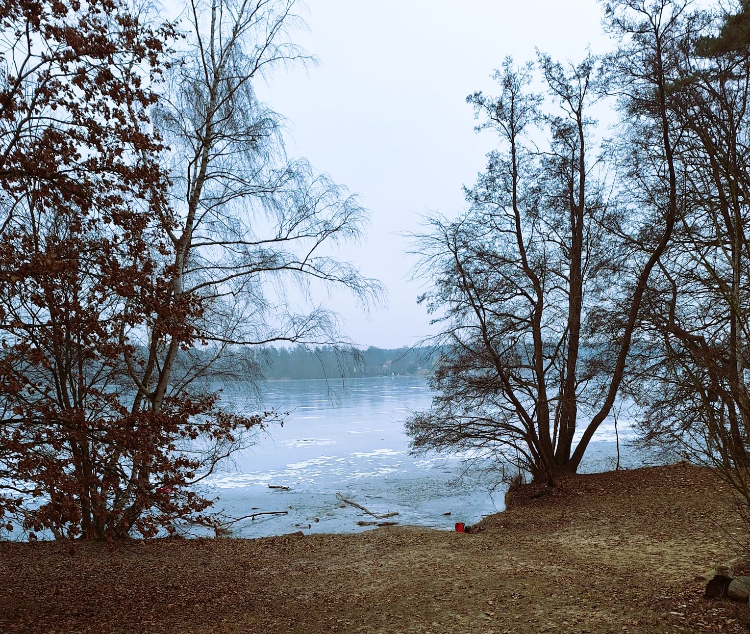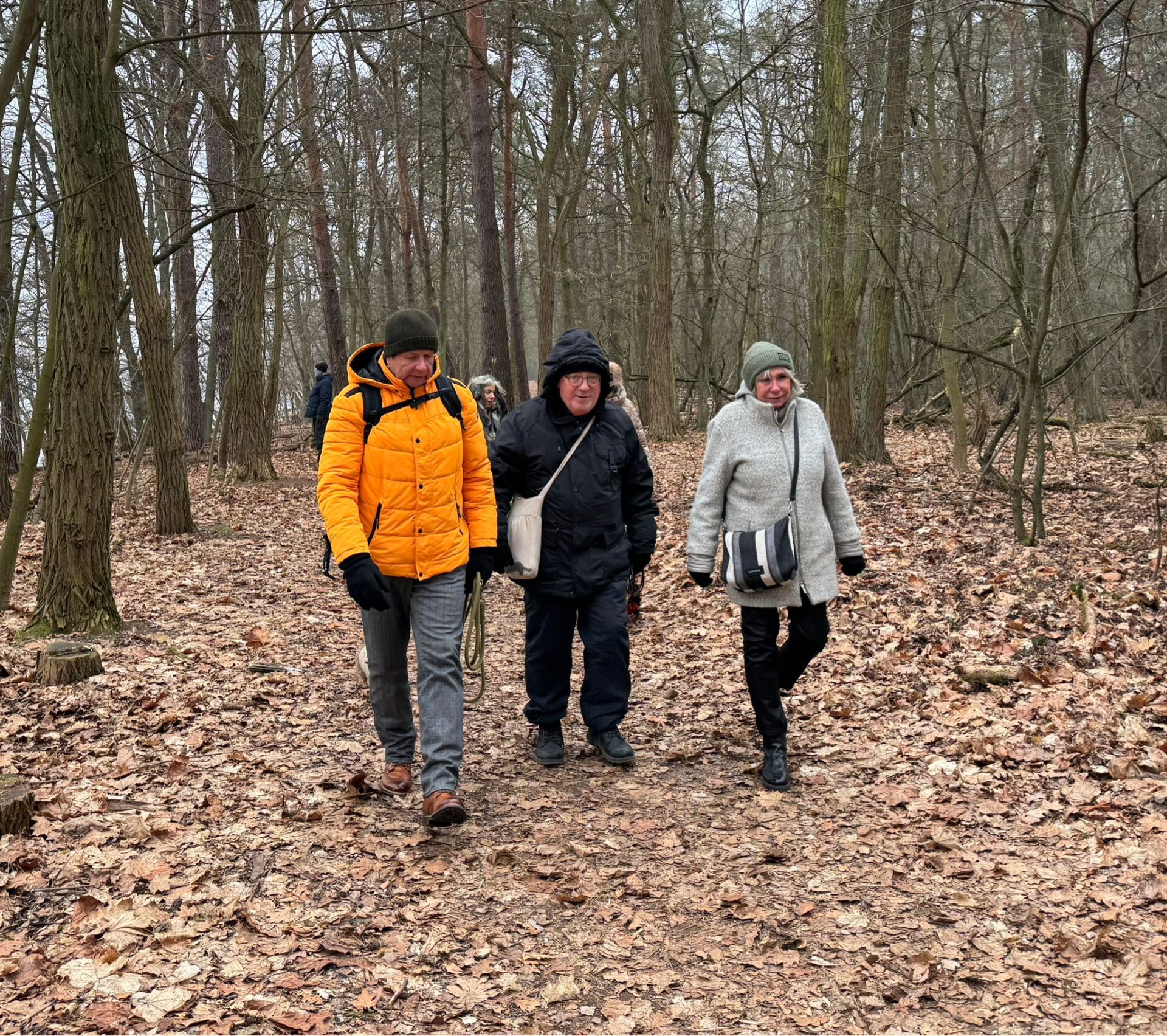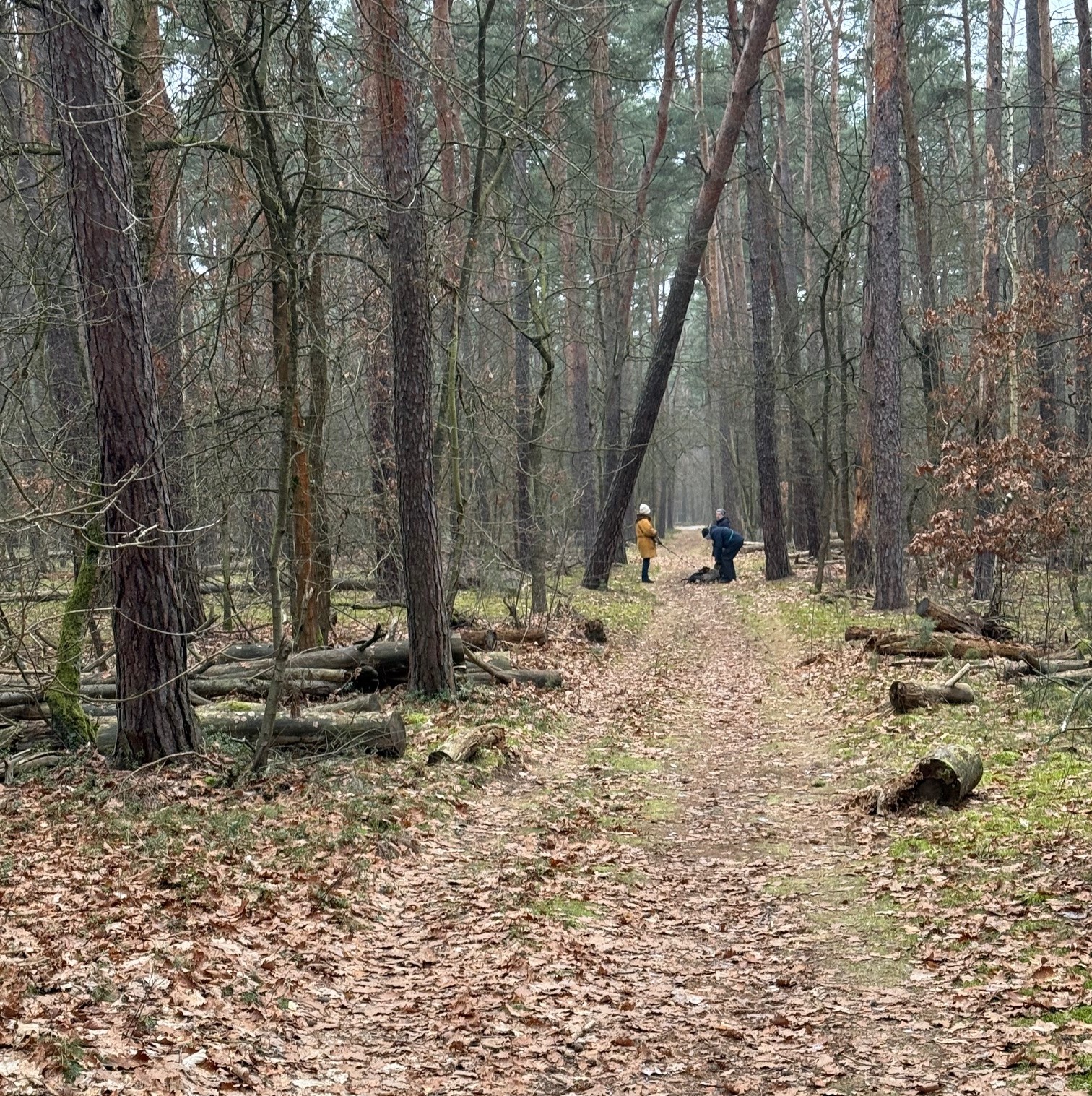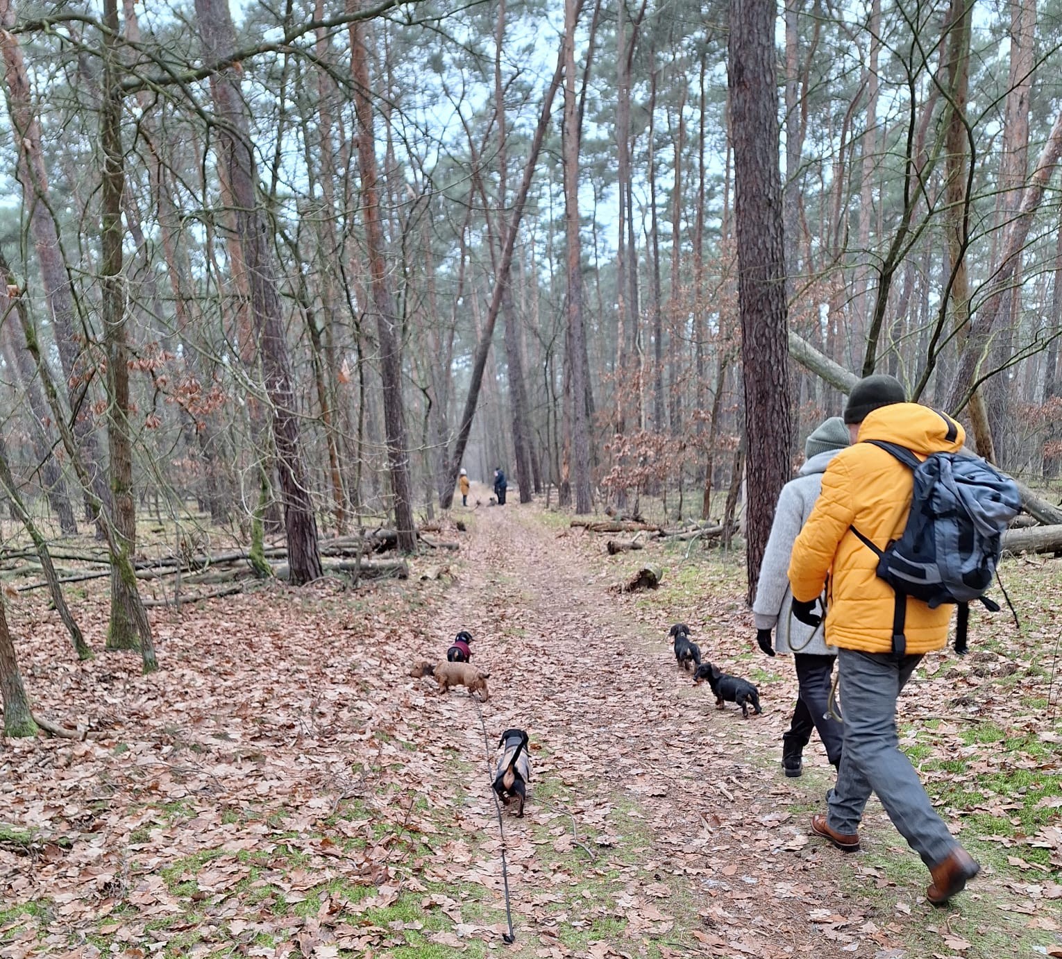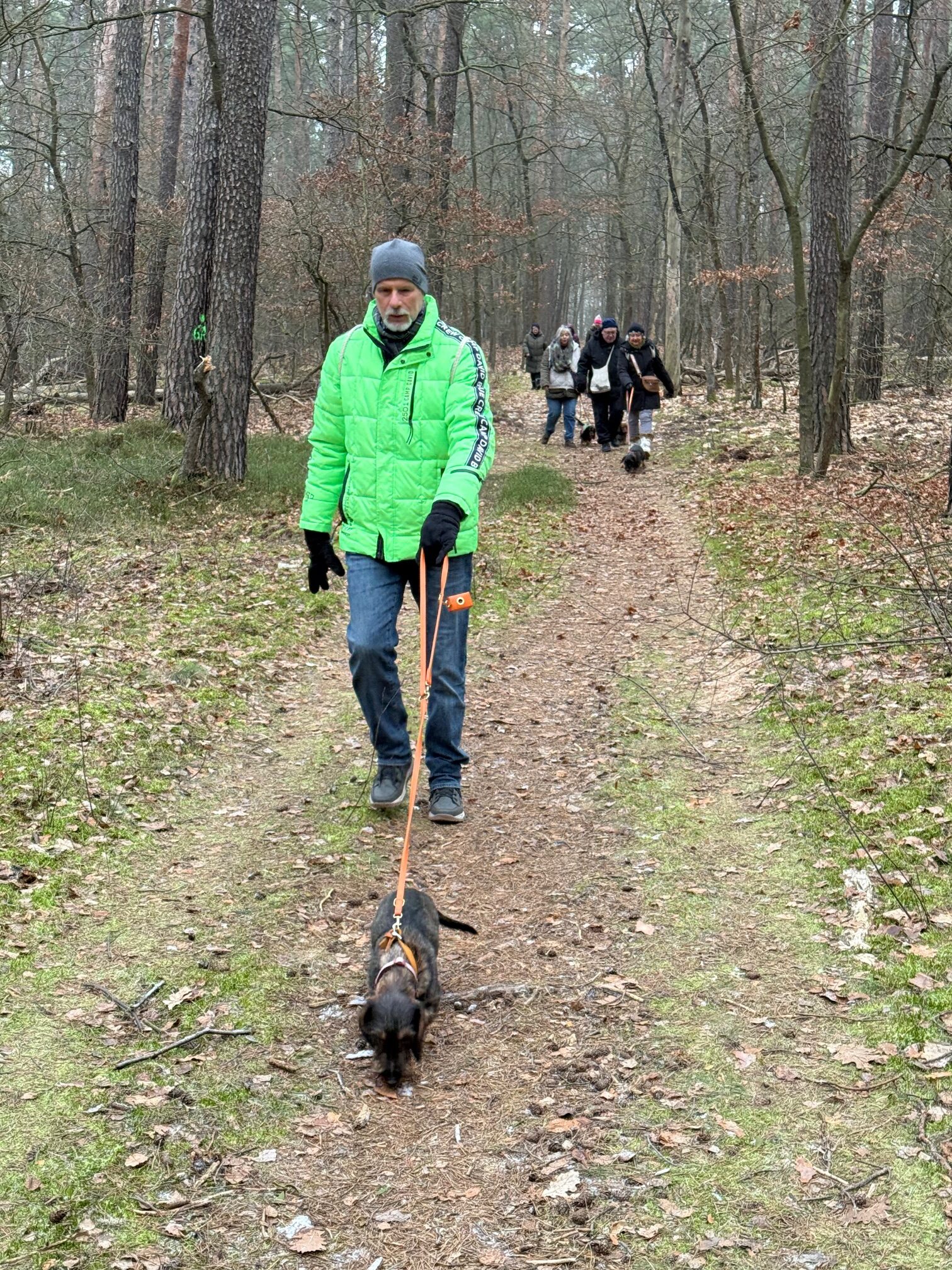 Mal wieder zu Besuch im Jagdrevier von Bella und Donnie im südöstlichsten Zipfel von Berlin – Schmöckwitz. Einschließlich der beiden Gastgeber trotzen 15 begleitete Dackel den widrigen Temperaturen des Januars, die meisten Aufrechten schick verkleidet bzw. eingemummelt. Unser Rundweg führte uns zunächst entlang am sog. „Großen Zug“, dem Verbindungsgewässer zwischen Krossinsee und Dahme, zurzeit verwandelt in eine arktische Eisfläche. Am Kinderspielplatz „Rauchfangwerder“ zog auf dem Eis sogar ein einsamer Schlittenführer seine Bahn. Vielleicht doch etwas waghalsig. Die Dackel blieben lieber auf festem Boden auf dem Weg. Zurück gings durch den Wald und hier konnte man sogar ein bisschen Grün (Moos) sehen, wohltuend im sonstigen Grau des Berliner Winters.